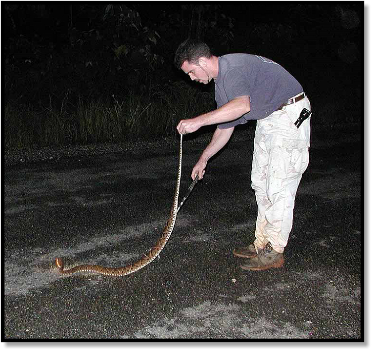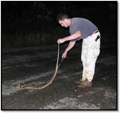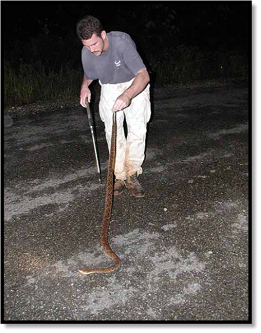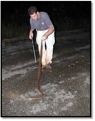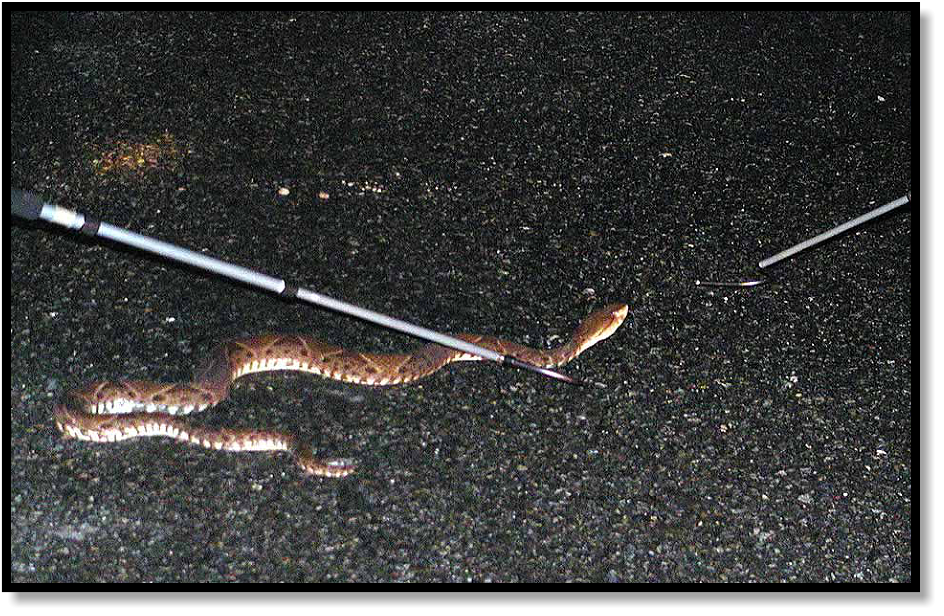 We grab our hooks and move slowly from the car, trying not to spook the snake. Ron takes pictures while
