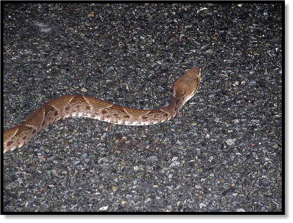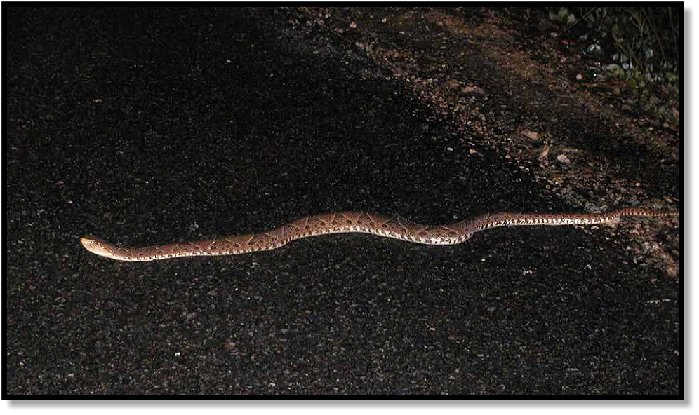 I move the snake back towards the center of the road, but Fer-de-Lances don’t like to ride a hook, so she slips off
