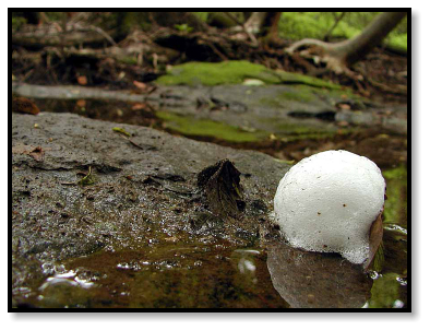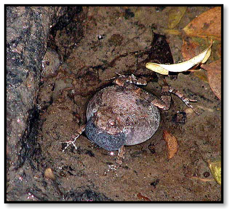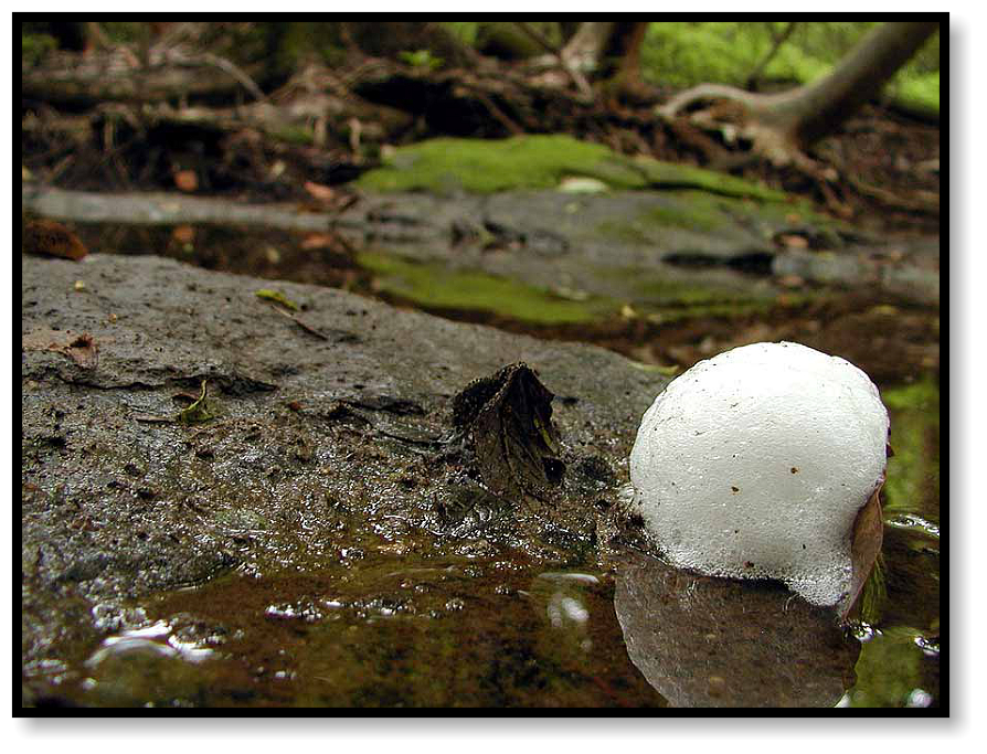 And wading in a still, shallow stream we find a foam nest anchored to a mat of leaves. Following mating in some