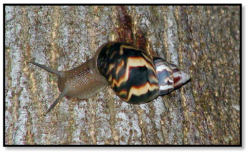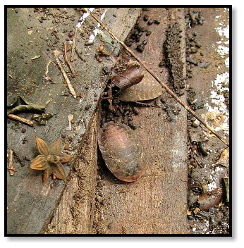 Not too many herps, so we settle for invertebrates: Large, round roaches hiding beneath boards; a tree snail on