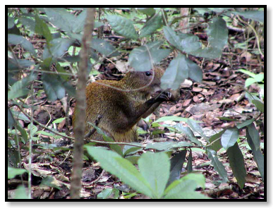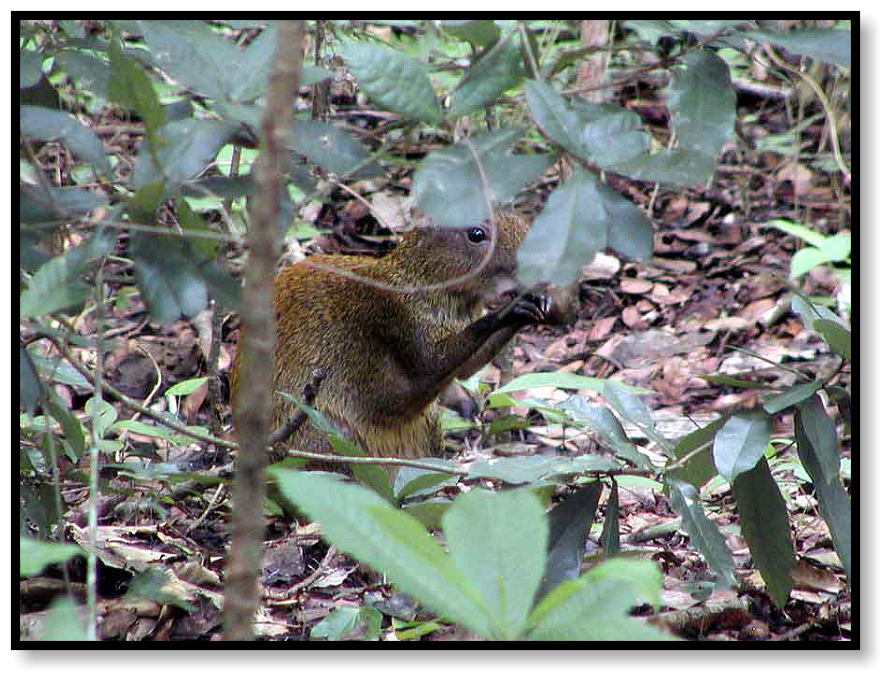 Through the leaves we spot an Agouti, a large brown rodent the size of a cat, sitting up and nibbling on a snack.