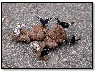 a, uh, tree; butterflies on branches and butterflies on the street, mobbing a meal of delicious dung (obviously taste is