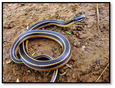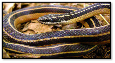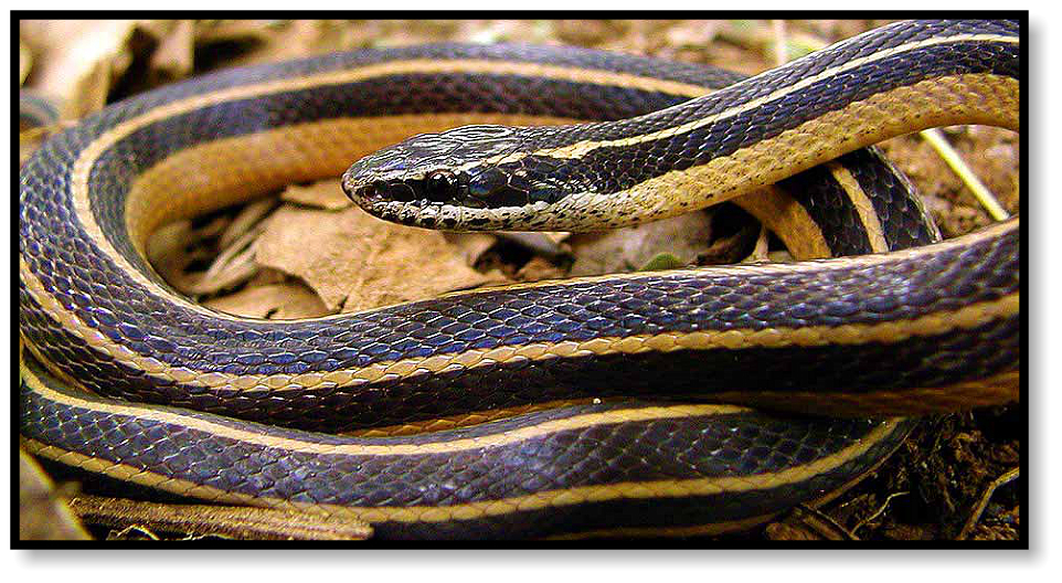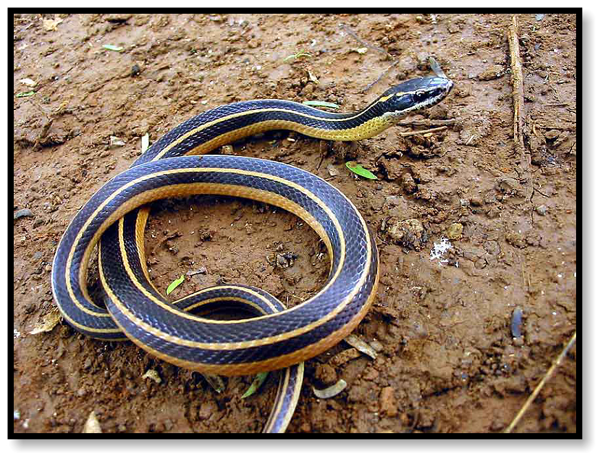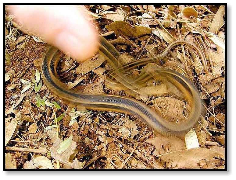 Now Ron’s standing near that same spot, holding a snake about three feet long, two stripes clearly running