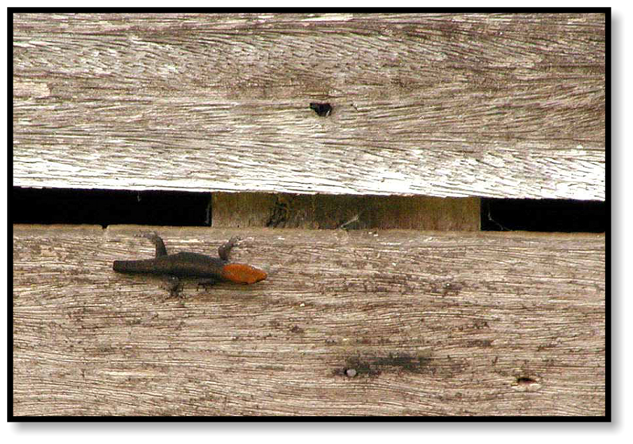 themselves: a truncated Yellow-headed Gecko, a Black-headed Frog, a Rose-bellied Fence Lizard, and from under a