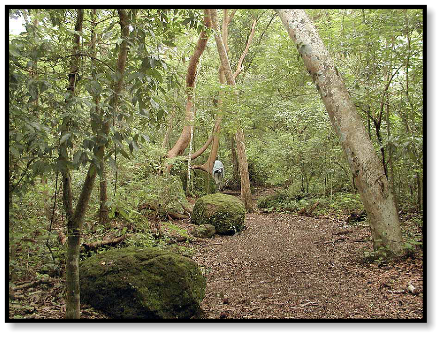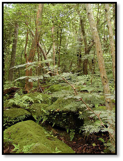 We make our way into the woods, amidst mossy boulders and thorny shrubs, finding an occasional lizard on a