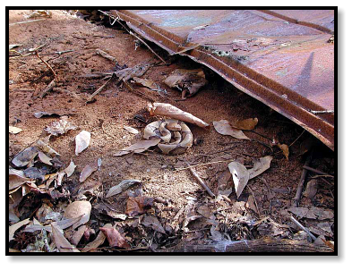 of half-buried tin, and underneath lies a Copperhead, all coiled and composed.
