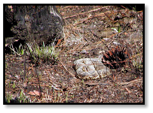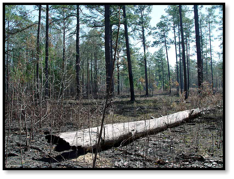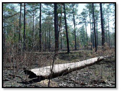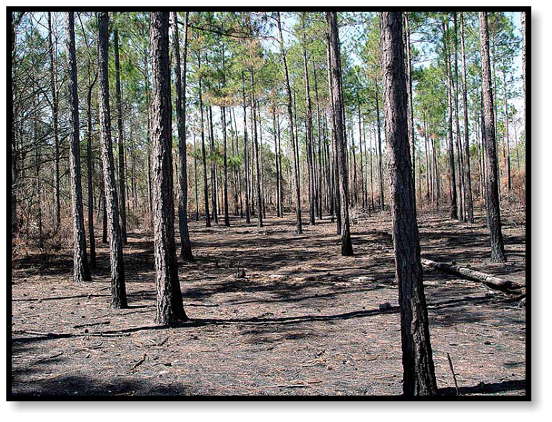 The area has been scoured by fire, eliminating the dense, green undergrowth that would normally cover the