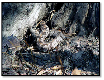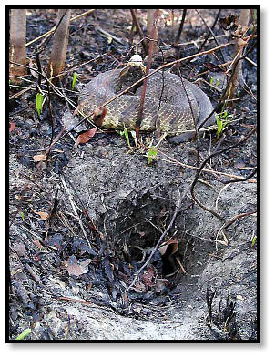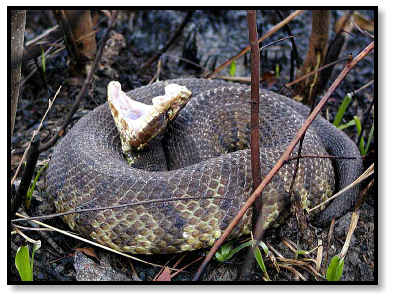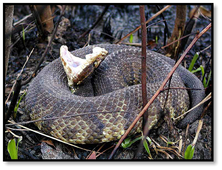 Cottonmouth. Bill explains that sometimes they migrate into the woods to seek underground shelter for the winter,