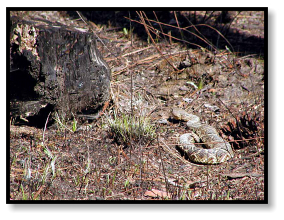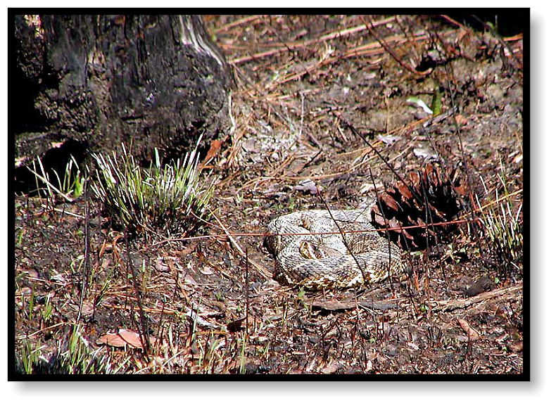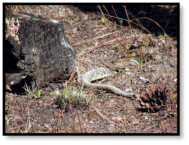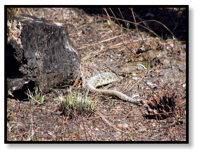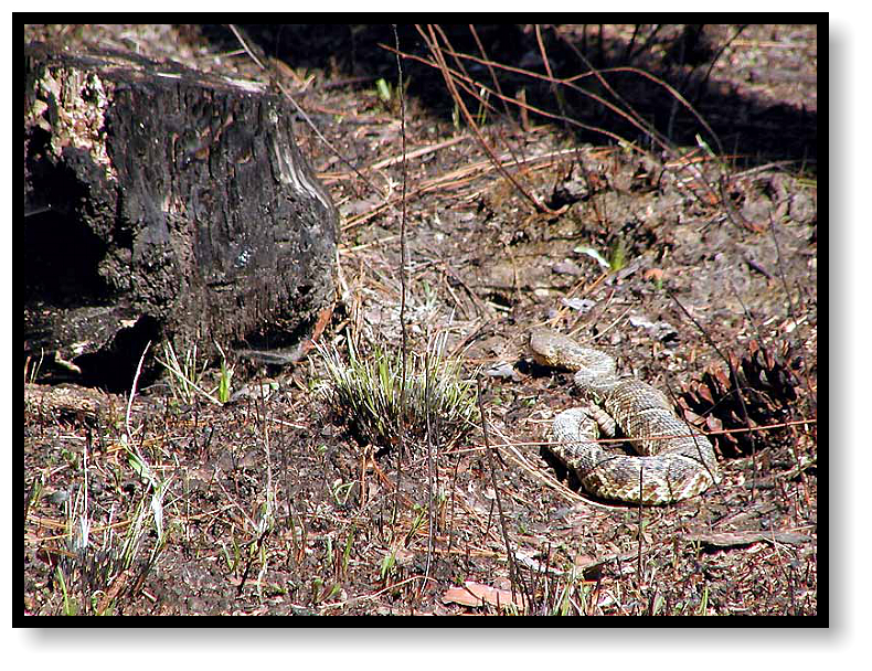 any sign of herps. Suddenly someone says, “Diamondback!” and we all freeze. Off in the distance, coiled near a