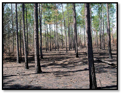 ground. The gray surface lies open and exposed, a lawn of ash in a park of charred pines and sooty stumps. Without