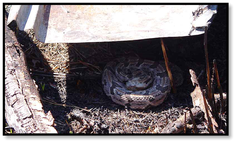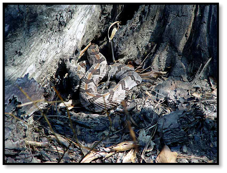 where I’ve seen Canebrakes,” he exclaims, and as we approach he says, “Like that one.” Sure enough, there’s a snake