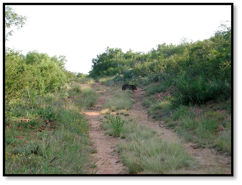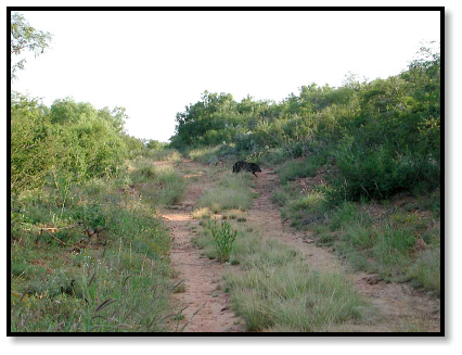 As the sun is going down I see something large and black crossing the road way up ahead. I immediately
